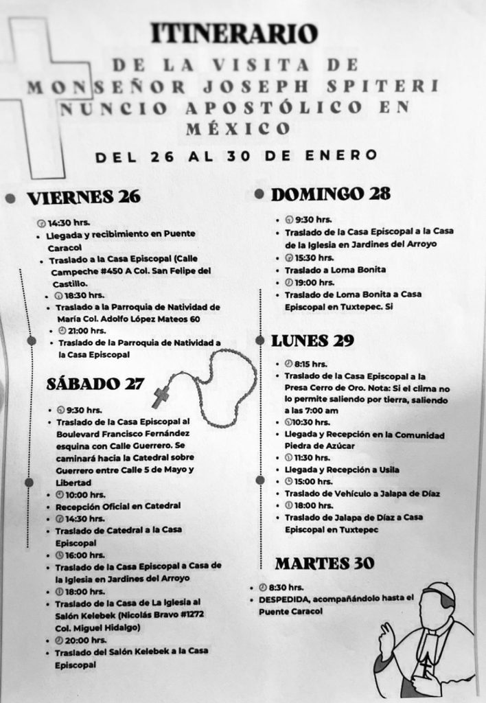El enviado del Vaticano llega a Tuxtepec este viernes 26 de enero. Su itinerario incluye una visita a Loma Bonita, a la comunidad Piedra de Azúcar, a Usila y a Jalapa de Díaz.